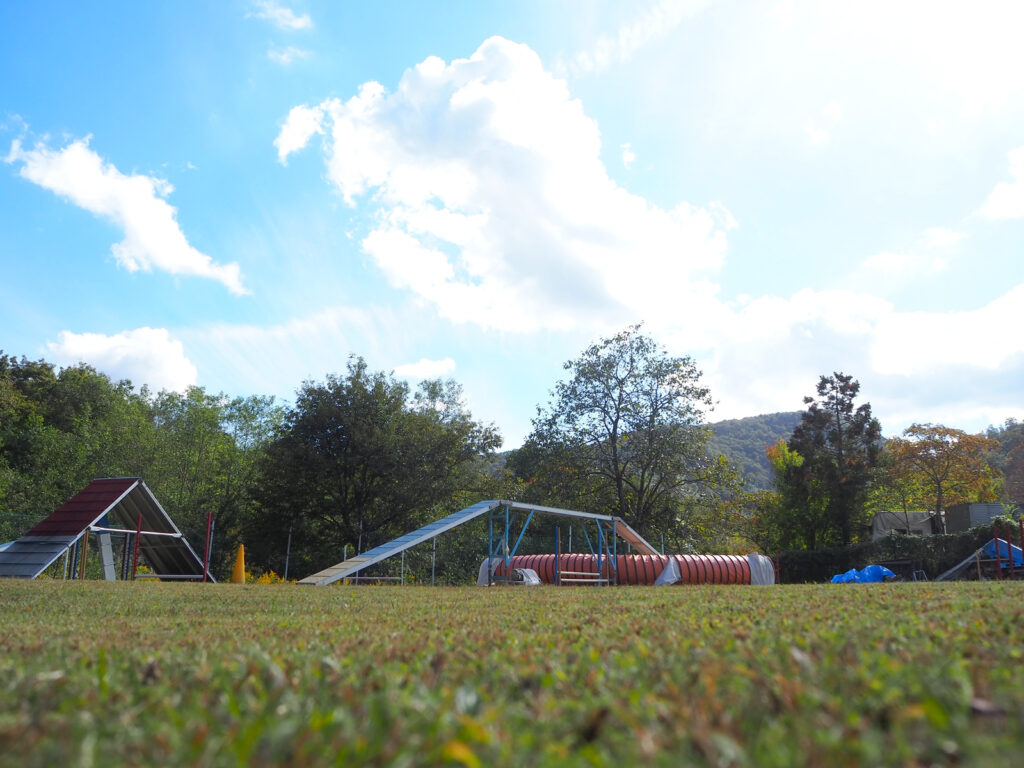 300坪を超える広さの全面芝生のランがあり、アジリテイの道具も常設しております。